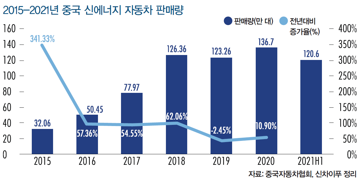 중국 공신부(工信部, 공업정보화부)가 2021년 8월 26일 처음 발표한 ‘중국자동차산업발전연보’에 따르면, 2020년 중국의 자동차 총판매량은 2,531만 대로, 12년 연속 세계 1위를 차지했다. 그중 신(新)에너지 자동차 판매량은 136만 7천 대로 전년대비 10.9% 증가했다. 이미 3년 연속 100만 대 이상 판매하며 6년 연속 세계 1위를 달성했고, 2021년 성장세는 더욱 가파르다. 오늘날 유망 산업이 된 신에너지 자동차 사업은 중국에서 2009년부터 시작되었다. 당시 금융위기에 대처하기 위해 중국 국무원이 ‘자동차산업 조정과 활성화 계획’을 발표하고, 신에너지 자동차 전략을 제시했다. 중국정부 재정에서 보조금을 지원하고, 대도시 및 중소도시 정부가 버스나 택시와 같은 대중교통 분야에서 신에너지 자동차를 우선적으로 채택하도록 했다.