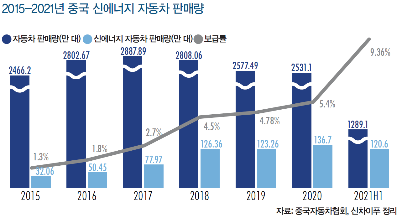 2021년 상반기, 중국의 신에너지 자동차 판매량은 120만 6천 대를 기록했다. 이는 2020년 한 해 판매량인 136만 대에 육박하는 수준이자, 세계 판매량의 50% 가까이를 차지하는 규모이다. 같은 기간 신에너지 자동차 보유량은 603만 대로 전체 자동차 총량의 2.06%를 차지했다. 이 중 순수 전기차는 493만 대로 81.68%를 차지한다. 2019년에는 중국 당국의 보조금 축소로 인해 신에너지 자동차 소비량이 급감했다. 설상가상으로 2020년에는 코로나 사태로 인해 자동차시장의 정부보조금 기한이 2년 유예되었다. 그러나 그해 하반기에는 신에너지 자동차 판매량이 회복되었고, 2021년 상반기에는 사상 최대치를 기록했다. 각 브랜드의 신모델 출시와 함께 신에너지 자동차 판매량은 계속해서 확대될 것으로 보인다.