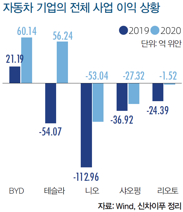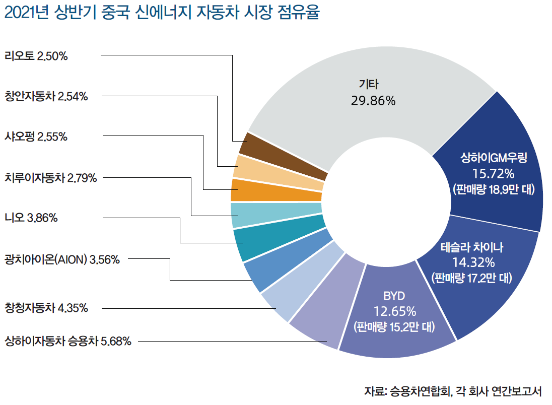 2021년 상반기, 상하이GM우링(上汽 通用五菱)은 테슬라 차이나와 BYD를 제치고 신에너지 자동차 판매량 1위를 차지했다. 상하이GM우링의 판매량 비중은 전체의 약 15.72%에 달했다. 또한 BYD가 2020년 판매 1위에서 2021년 상반기 3위로 밀려난 사실은 선두업체 간 경쟁이 더욱 치열해졌음을 말해준다. 전통 자동차 기업인 폭스바겐과 볼보도 신에너지 자동차에 아낌없이 투자하는 중이다. 니오, 샤오펑, 리샹등 신생 자동차 제조기업은 나름의 돌파구를 마련하고 있다. 생산과 판매 규모를 신속히 늘려 수익성을 향상시킨 것이다. 그러나 실력 있는 전통 연료 자동차 기업들이 신에너지 자동차 개발에 전력을 다하고 있고, 샤오미와 같은 영리한 경쟁자들도 지속적으로 유입되면서 선두업체의 우위가 계속 유지될지는 미지수이다.