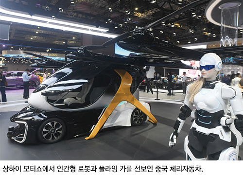 인간형 로봇의 등장 외에도 상하이 모터쇼에서 주목할 점은 중국 자동차 기업들이 하늘을 나는 자동차라 불리는 ‘플라잉 카’를 선보였다는 것이다.