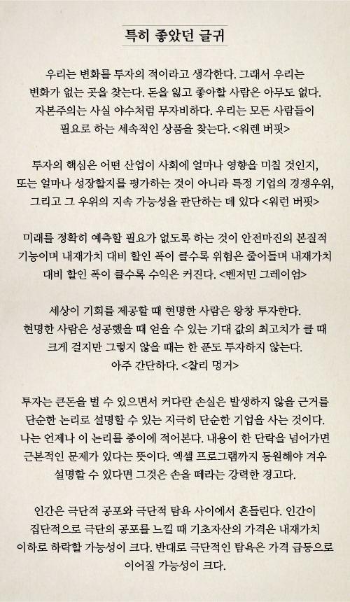 이 책이 찰리 멍거와 워런 버핏의 철학으로 구성했다는 게 빈말이 아님을 알 수 있고 실제 책에서는 이해를 돕기 위해 두 분의 말씀을 무진장 인용합니다. 운용하는 펀드에서 엄청난 수익을 올리는 뛰어난 투자자이면서도 버핏을 존경하는 마음을 숨기지 않는 겸손한 성품의 소유자이기에 그의 말씀은 믿을 수 있습니다.