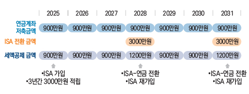 연금계좌의 연간 세액공제 한도는 900만원이다. 매년 세액공제 한도만큼 연금계좌에 적립한다. 3년간 ISA에도 3000만원을 적립한다. 4년 차에 ISA를 해지한 다음 만기해지자금을 연금계좌에 전환한다.