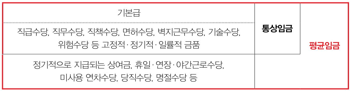 이보다 더 확장된 개념인 ‘평균임금’에는 통상임 금의 모든 항목들에 더해서 정기적으로 나오는 상여금, 휴일·연장·야간근로수당, 미사용 연차수당 등이 포함된다. 사용자로부터 받는 거의 모든 금품이 들어간다고 이해하면 쉽다(표 2 참조).