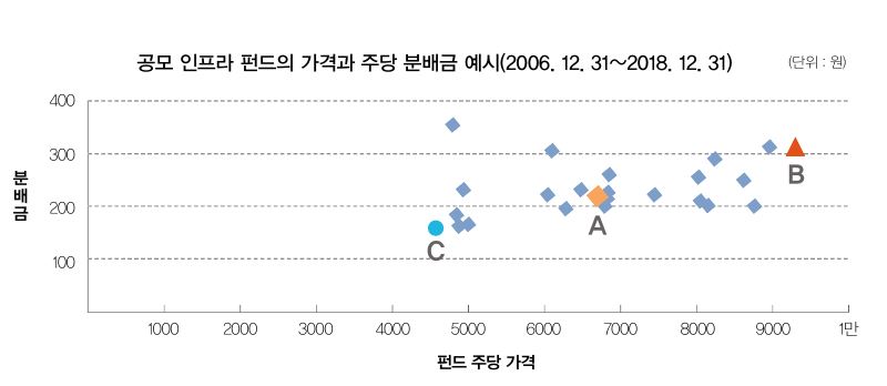 위 그래프는 2006년 말부터 2018년 말까지 인프라 펀드의 주당 가격과 분배금을 나타낸 것이다. 해당 펀드는 6개월마다 배당을 하므로 표시된 주당 분배금은 반년치 배당금을 의미한다. 2006 년 말 6700원(A)이었던 해당 인프라 펀드는 2018 년 말에는 9290원(B)까지 가격이 상승했다. 그 와중에 한때 4500원(C) 대로 하락하는 등 어느 정도의 가격 변동성이 있었다. 그러나 주당 분배금은 평균적으로 200~250원 사이를 유지했다. 즉 자산 가격 변동성에 비해 인컴의 변동성이 낮다고 볼 수 있다.