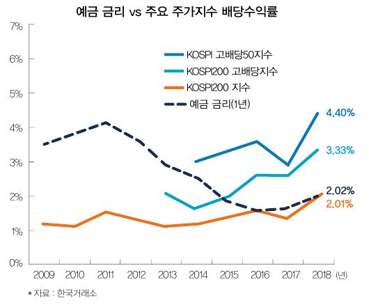 2018년 기준 KOSPI200 고배당지수의 배당수익률은 3.33%, KOSPI 고배당50지수는 4.4%였다.
