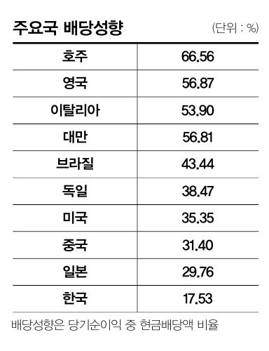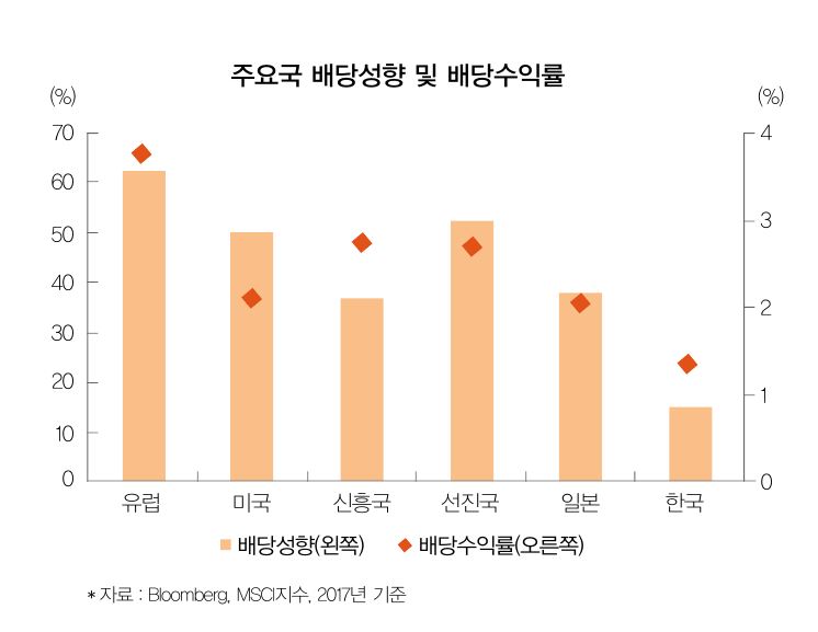 2017년 기준으로 한국 기업의 배당 성향은 18% 정도였다. 반면 호주는 67%, 영국은 57%, 대만은 57%였으며, 미국은 35%였다. 주요 선진국들 중 한국이 제일 낮은 상황인 것이다. 이에 따라 배당수익률도 가장 낮다. 위 그래프는 주요국 들의 배당성향과 배당수익률을 보여준다. 배당 투자가 목적이라면 굳이 한국에만 머물 이유는 없어 보인다.