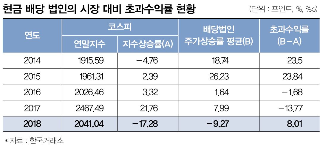 다만 배당주가 다른 일반 주식에 비해서는 주가 하락 시 하락률이 적은 경향이 있다. 한국거래소의 분석에 따르면 2018년에 KOSPI지수가 -17.28%하락하는 동안 현금 배당을 실시한 545개 기업의 평균 주가는 -9.27% 하락했다. 배당주라고 해서 주가 하락을 완전히 피할 수는 없지만, 전체 지수의 하락률보다는 나은 성적이다. 장기 투자를 할때는 수익을 내는 것도 중요하지만 시장이 하락할때 방어하는 것도 중요하다.