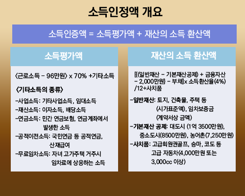 기타소득에는 사업소득, 재산소득, 공적이전소득, 무료임차소득이 있다. 사업소득에는 도·소매업과 제조업 등 사업을 해서 소득뿐만 아니라 부동산 임대소득도 포함된다. 재산소득에는 이자와 배당소득뿐만 아니라 연금소득도 포함된다. 연금소득이란 연금계좌(연금저축, IRP)에서 인출하는 금액 중 연금소득세를 과세대상인 소득과 보험회사의 연금보험에서 발생한 소득도 포함된다. 공적이전소득이란 국민연금 등 공적연금과 산재급여를 말한다. 마지막으로 주의해야 할 것은 무료임차소득이다. 본인 또는 배우자가 자녀 소유의 고가주택(6억원)에 거주하는 경우, 해당 주택가격의 0.78%를 무료임차소득으로 본다.