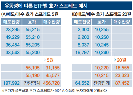 ‘위 표’는 ETF별 호가 스프레드를 보여주고 있다. A ETF의 경우 매도호가와 매수호가가 모두 5원별로 형성돼 있다. 유동성이 높다는 뜻이다. 따라서 투자자는 합리적인 가격으로 매매가 가능하다. 반면 B ETF는 최저 매도호가와 최고 매수호가의 차이가 20원에 달한다. 이럴 경우 상대적으로매매가 쉽지 않으며, 특히 급하게 사고팔 때 불합리한 가격으로 거래하게 될 가능성이 높아진다. 유동성이 상대적으로 낮다고 할 수 있다.