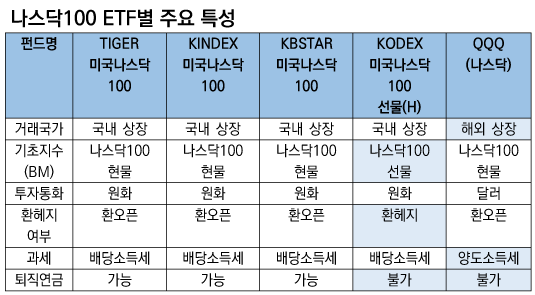 우선 국내 상장 ETF와 해외 상장 ETF 중 어떤 것에 투자할지 결정해야 한다. 둘의 가장 큰 차이는 이익에 대한 과세방법이다. 국내 상장 나스닥100 ETF는 이익에 대해 15.4%의 배당소득세 및 지방소득세를 내야 한다. 또한 다른 이자 및 배당소득과 합쳐 연 2000만원이 넘으면 다른 소득과 합산해 종합과세 된다.