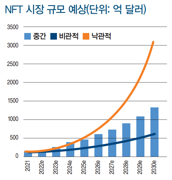 2021년, NFT 시장은 폭발적으로 성장했다. 디앱(Dapp: 단일 서버 대신 노드의 분산 네트워크로 운영되는 프로그램)을 거래하는 디앱 레이더(Dapper Radars)의 데이터에 의하면, 2021년 3분기 NFT의 거래량은 100억 달러 수준에 달해 2020년 동기대비 300배 이상 증가했다. 모건 스탠리는 2030년에 이르면 NFT 시장 규모가 1,500억에서 3천억 달러 수준에 달할 것으로 예측하기도 했다.