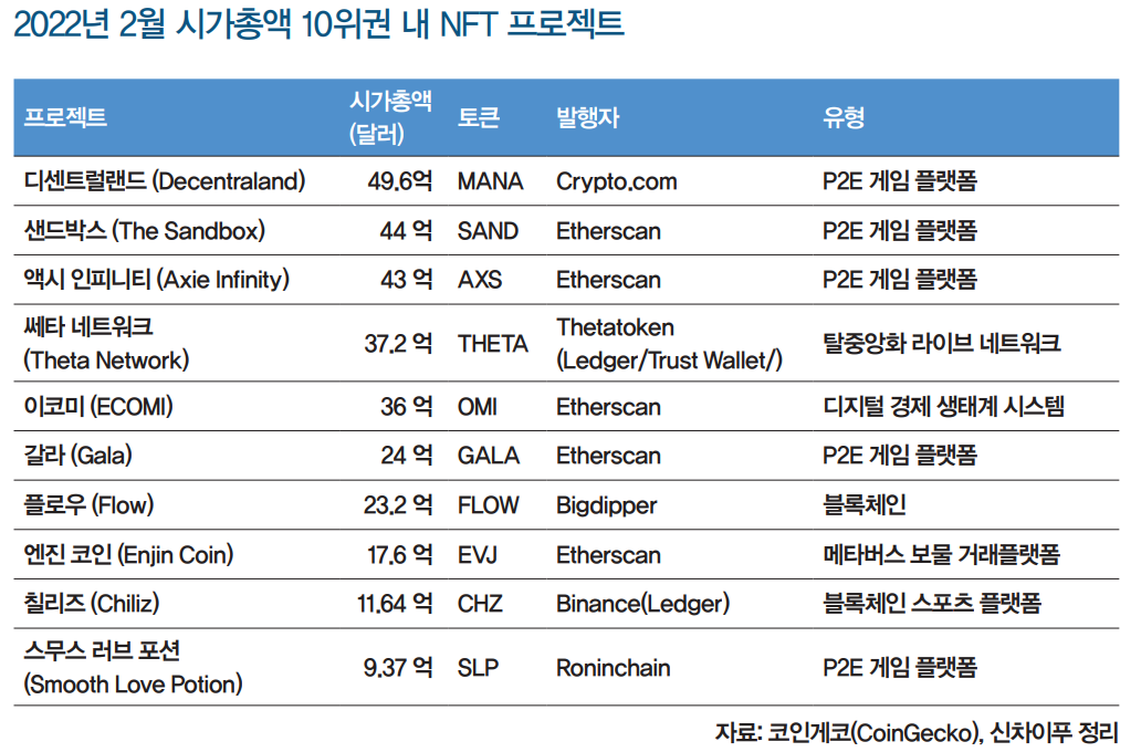 그중, P2E 게임 플랫폼의 시가총액은 NFT 시가총액의 40%를 차지한다.
