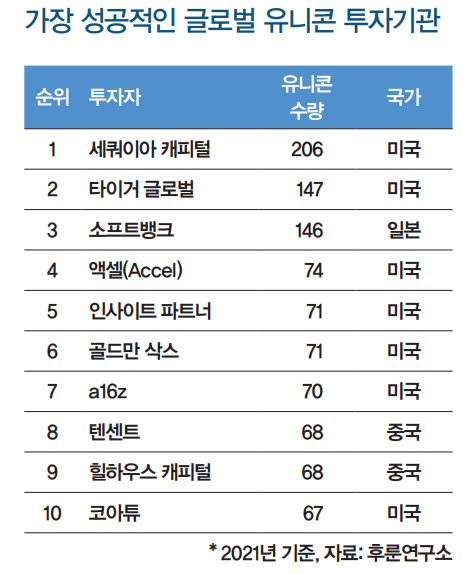 후룬(胡潤)연구소의 ‘2021 글로벌 유니콘’ 차트에 따르면, 가장 성공적인 글로벌 유니콘 투자기관 10위 명단에서 a16z가 7위를 차지했다. 이는 2020년 9위에서 2단계 상승한 순위다. 세계적으로 가장 성공한 사냥꾼으로 불리는 세쿼이아 캐피털은 206개 유니콘 기업에 투자해 20%의 점유율로 1위를 차지했다.