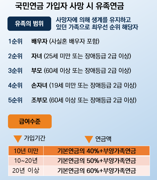우선 사망자에게 배우자가 있으면 배우자가 유족연금을 수령한다. 이때 법정 혼인관계에 있는 배우자만 아니라 사실혼 관계의 배우자도 유족연금을 수령할 수 있다. 배우자가 없으면 자녀(25세 미만), 부모(60세 이상), 손자녀(19세 미만), 조부모(60세 이상) 순으로 유족연금이 지급된다. 자녀, 부모, 손자녀, 조부모가 장애등급 2급 이상이면 나이와 상관없이 유족연금을 수령할 수 있다.