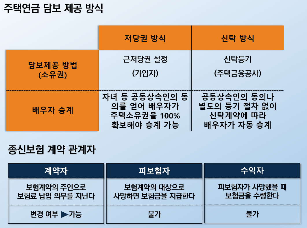 주택연금을 수령하던 중 주택 소유자가 먼저 사망하는 경우 배우자가 계속 연금을 수령하려면 어떤 조치를 취해야 할까. 이는 담보제공 방식에 따라 다르다. 주택연금의 담보제공 방식은 저당권 방식과 신탁 방식으로 나뉜다. 저당권 방식은 주택 소유자가 주택에 저당권을 설정해 담보를 제공하며, 신탁 방식은 주택 소유자와 주택금융공사가 체결하는 신탁계약을 체결해 담보를 제공한다.