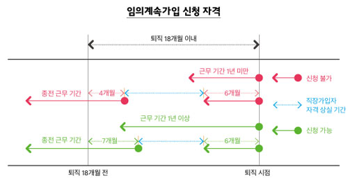 임의계속가입 신청을 하려면 퇴직 전 18개월간 직장 가입 자격을 유지한 기간이 통산 1년 이상 이어야 한다. 직장을 옮기고 얼마 지나지 않아 퇴직한 경우에도 최종 사용관계가 끝난 날을 기준으로 이전 18개월 동안 통산 1년 이상 직장가입자 자격을 유지하고 있었다면 재가입할 수 있다. 국민건강보험공단에서는 퇴직 이전 18개월 기간 동안 직장 가입 자격이 1년 이상인 사람 중에서 가입자가 부담한 직장 건강보험료보다 지역건강보험료가 많은 사람에게 임의계속가입 안내문을 발송하고 있다. 다만 세대 내 사업소득이 있는 경우에는 안내문을 발송하지 않는다. 임의계속가입 신청은 퇴직 후 최초로 고지를 받은 지역가입자 보험료의 납부 마감일로부터 2개월 이내에 해야 한다. 신청 기간이 지나면 가입이 불가하다. 가입 신청은 본인이 국민건강보험공단을 직접 방문해서 해도 되고, 방문하기 어려운 경우에는 팩스, 우편, 유선으로 신청할 수도 있다.