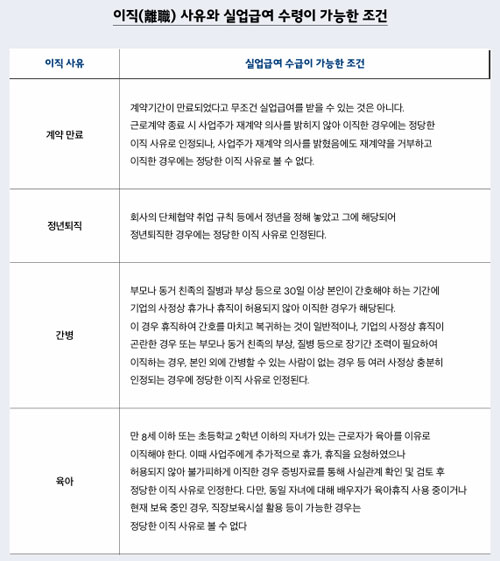 정년이 도래하거나 계약기간이 만료돼 회사를 다닐 수 없게 된 경우도 비자발적인 퇴직으로 보아 구직급여를 받을 수 있다. 하지만 개인 사정으로 퇴직하는 경우에는 실업급여를 받을 수 없다. 본인 귀책사유로 퇴직하는 경우에도 구직급여를 받을 수 없다. 자발적인 퇴사라 할지라도 이직을 회피하려는 노력을 다하였으나 사업주의 사정으로 더 이상 근로하는 것이 곤란한 경우에는 불가피성을 인정하여 구직급여를 받을 수 있다. 직장 내 괴롭힘을 당했거나, 임금이 2개월 이상 체불됐거나, 임신·출산·육아 등으로 일할 수 없는 경우에도 구직급여를 받을 수 있다. 사업장을 이전하거나, 다른 지역으로 전근 가거나, 배우자 또는 부양가족과 동거하기 위해 거소를 이전해야 해서 통근이 곤란한 경우(왕복 통근 시간 3시간 이상)에도 수급자격이 인정된다.