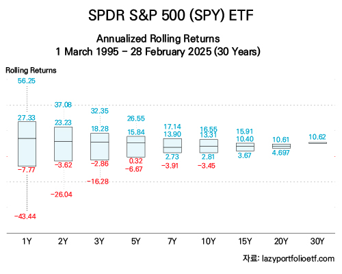 아래 표는 미국 S&P 500 지수의 지난 30년 롤링 (rolling) 수익률을 나타냅니다. 풀어서 설명하면, 30년 전인 1995년부터 오늘까지 무작위로 아무 날에 S&P 500 지수에 투자하고, 1년, 2년, 3년 등의 기간이 경과한 후의 연 수익률 분포입니다. 투자 기간이 같더라도 투자 시작 날짜를 무작위로 선택했으니 수익률은 제 각각 일 것입니다. 운이 좋은 경우 수익률이 매우 높을 것이고, 운이 나쁜 경우 그 기간에 큰 손실을 보았을 것입니다. 그 최대 수익과 최대 손실의 범위를 표시한 도표입니다. lazyportfolioetf.com 라는 사이트에서 가져왔습니다.