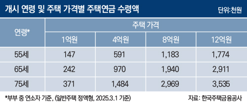 수령 금액은 가입 당시의 부부 중 연소자의 연령과 주택 시세 또는 감정평가액에 따라 정해진다. 예컨대 부부 중 연소자가 65세이며 주택 시세가 6억원일 때 주택연금 월 수령액은 약 146만원(일반주택 정액형, 2025년 3월 1일 기준)이다. 연령 및 주택 시세별 수령액은 한국주택금융공사 홈페이지에서 미리 조회해볼 수 있다.