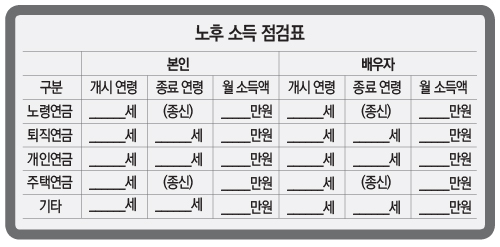 지금까지 주요 연금별로 수령 금액과 개시 시기를 확인하고, 정하는 과정을 살펴봤다. 아래 점검표에서 본인이 어떤 연금을 언제 개시하고, 매달 얼마나 받을 것이며, 언제 해당 연금 자산이 고갈돼 종료될지 정리해보면 소득이 부족한 기간은 없는지 부족한 금액은 얼마인지 점검해볼 수 있다.