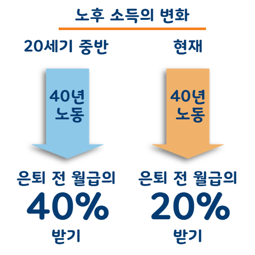 20세기 중반만 하더라도, 40년 정도를 일하고 은퇴하면 10년 정도 노후를 즐기다 세상을 떠났다. 단순 계산으로 소득의 10%를 40년 적립하면, 은퇴 전 월급의 40%를 10년 동안 받다가 세상을 떠나는 식이다. 그런데 요즘은 못해도 평균수명이 10년 정도는 늘었다. 40년 일하고 퇴직하면, 20년을 버텨야 한다. 같은 계산으로 소득의 10%를 40년 적립하면, 은퇴 전 월급의 20%를 20년 동안 받는 구조다. 생활비로 쓰기엔 팍팍한 금액을 받게 된 거다. 이런 상황을 해결하기 위해선 방법이 두 가지다. 미리 더 냈거나, 노후 세컨드잡을 가져야 한다.