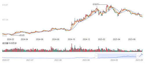 올 상반기 매출이 전년 대비 4348% 폭증했다는 소식으로 주가 곡선은 더 가팔라 졌다. 최고점(주가 1587.9 위안)을 찍었던 지난 8월 28일에는 전년 대비 무려 6.6배 폭등하기도 했다. 캠브리콘은 중국 증시의 AI 관련주 중에서도 황금주로 부각됐다.