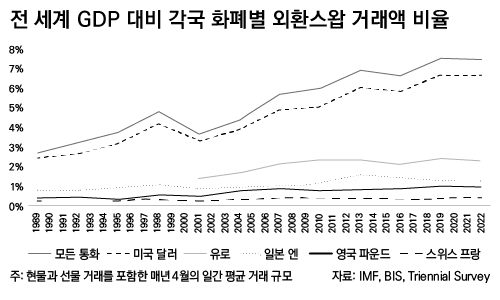 이 그래프의 데이터는 외환 스와프(foreign exchange swaps: 현물 환율로 특정 통화를 사고, 선물 환율로 반대 통화를 팔거나 그 반대로 동시에 실행하는 거래) 시장에서 어떤 통화가 가장 많이 거래되는지를 보여준다. 거대하고 이해하기 어려운 이 시장에서는 다국 적 기업, 글로벌 은행, 보험사, 증권 딜러, 연기금 등 전 세계의 막대한 자금을 운용하는 기관들 사이에서 하루 수조 달러의 거래가 이뤄진다. 달러는 유로화, 엔화, 파운드화, 스위스 프랑보다 훨씬 큰 규모로 거래되는 핵심 통화이다. 이 시장을 통해 거대 기업들이 환율 변동의 위험을 줄이고, 투자, 대출, 차입, 수출입 등 다양한 목적으로 달러를 활용할 수 있다.
