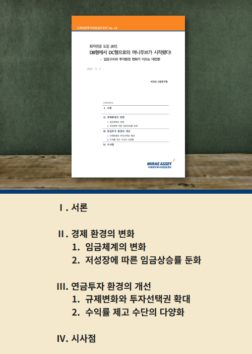퇴직연금 도입 20주년을 맞아 미래에셋투자와연금리포트 69호 「퇴직연금 20년, DB형에서 DC형으로의 머니무브가 시작됐다!: 임금구조와 투자환경 변화가 이끄는 대전환」이 발간됐습니다.