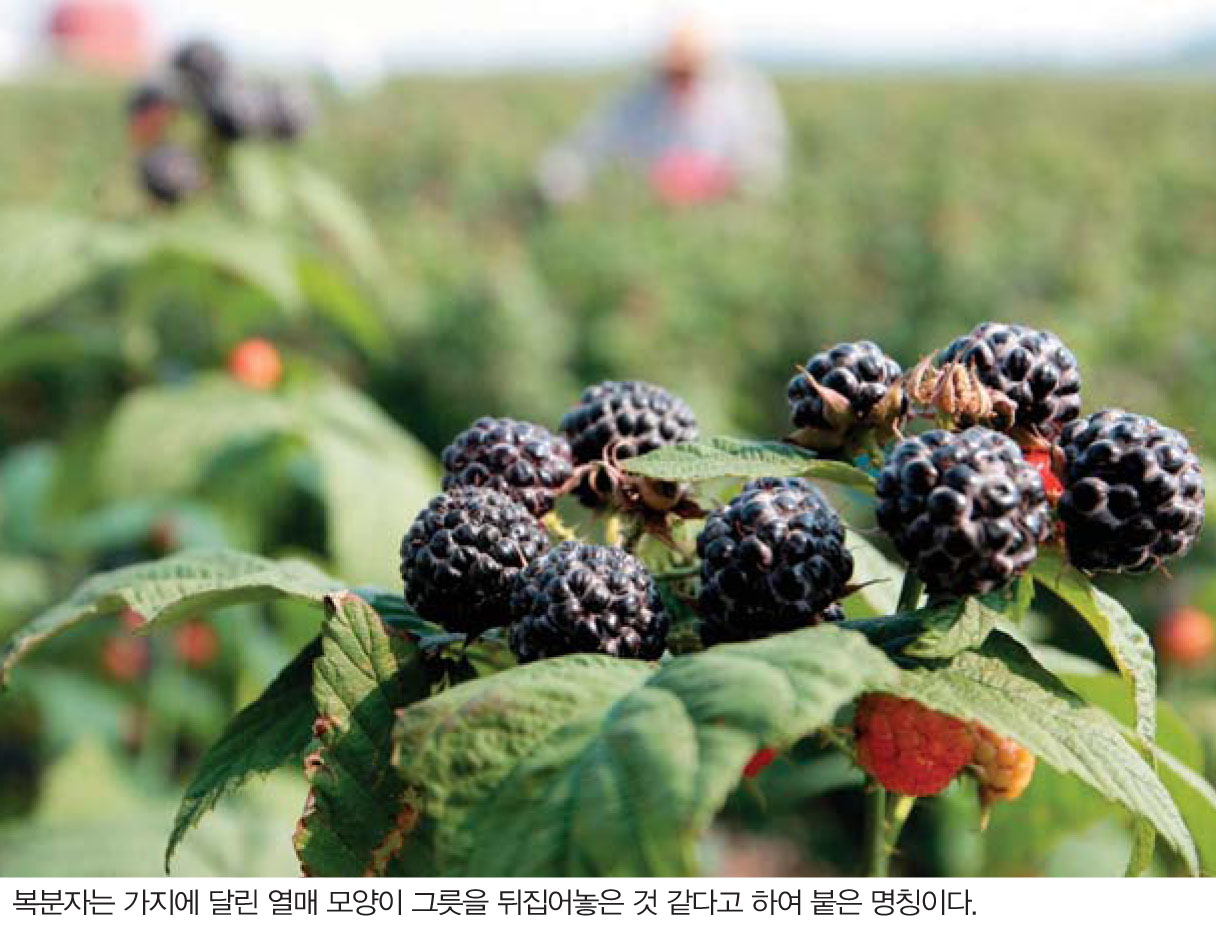 복분자(覆盆子)는 가지에 열매(子)가 매달린 모양이 마치 그릇(盆)을 뒤집어 놓은(覆) 것 같다고고 하여 붙은 명칭이다. 복분자를 산딸기의 한방 이름으로 오인하는 사람들이 많지만 껍질 색깔이 산 딸기보다 훨씬 검붉다. 산딸기의 영문명이 라스베리(Raspberry)라면 복분자는 블랙라스베리(Black Raspberry)이다.
