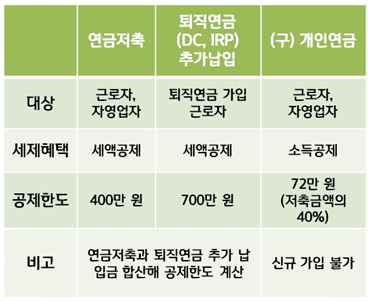 [표] 연금상품 종류별 소득∙세액공제 한도