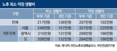 국민연금 연구원이 발표한 제10차 국민노후보장패널조사에 따르면 부부 기준 최소 노후생활비는 월 217만원, 적정 노후생활비는 월 297만원이다. 여기서 최소 생활비는 인간다운 삶을 유지하기 위한 최소한의 생활비, 적정 생활비는 품위 있고 안정적인 삶을 영위할 수 있는 수준의 생활비를 말한다. 살펴보면 부부 기준 적정 생활비는 서울은 337만원, 광역시는 299만원, 그 외 지역은 284만원이다. 이를 참고하면, 부부 기준으로 적정하게 생활하기 위해선 평균 290만~340만원이 필요하다.