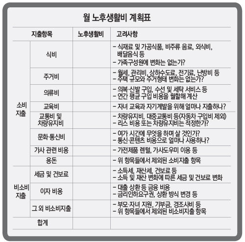아래는 직접 월 노후생활비 계획을 짤 수 있는 양식이 있다. 이 양식을 직접 한번 작성해보면 노후생활비를 정리할 수 있을 것이다. 그러면 노후 대비의 전 과정에서 커다란 첫 발걸음을 뗀 것이나 마찬가지다.